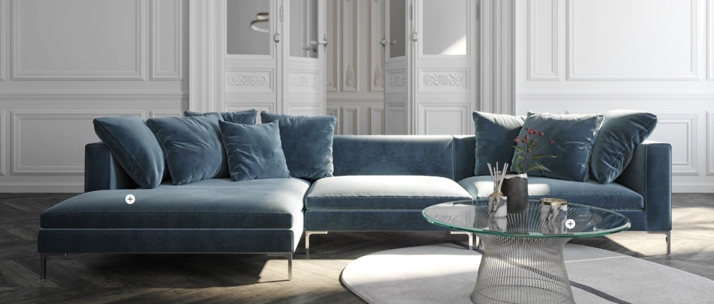 Nuestro sofá esquinero Kenia fusiona formas contemporáneas con detalles clásicos dándole un aire atemporal que se acomoda en distintos estilos decorativos. Este sofá de diseño versátil con líneas refinadas está confeccionado con una estructura de madera con base metálica recubierta con placa soft de 26kg y vellón siliconado para mayor confort. Este sofá en L incluye 6 almohadones para mayor comodidad. Disponible en variedad de telas y colores.